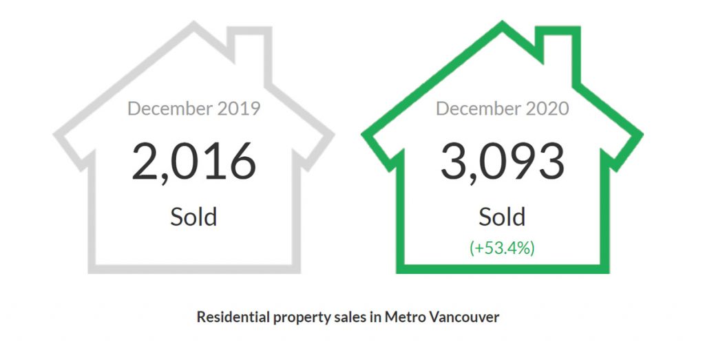 REBGV reports that residential home sales in the region totalled 3,093 in December 2020, a 53.4 per cent increase from the 2,016 sales recorded in December 2019, and a 0.9 per cent increase from the 3,064 homes sold in November 2020.