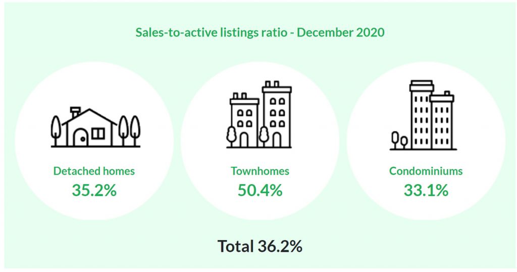 For all property types, the sales-to-active listings ratio for December 2020 is 36.2 per cent. By property type, the ratio is 35.2 per cent for detached homes, 50.4 per cent for townhomes, and 33.1 per cent for apartments.